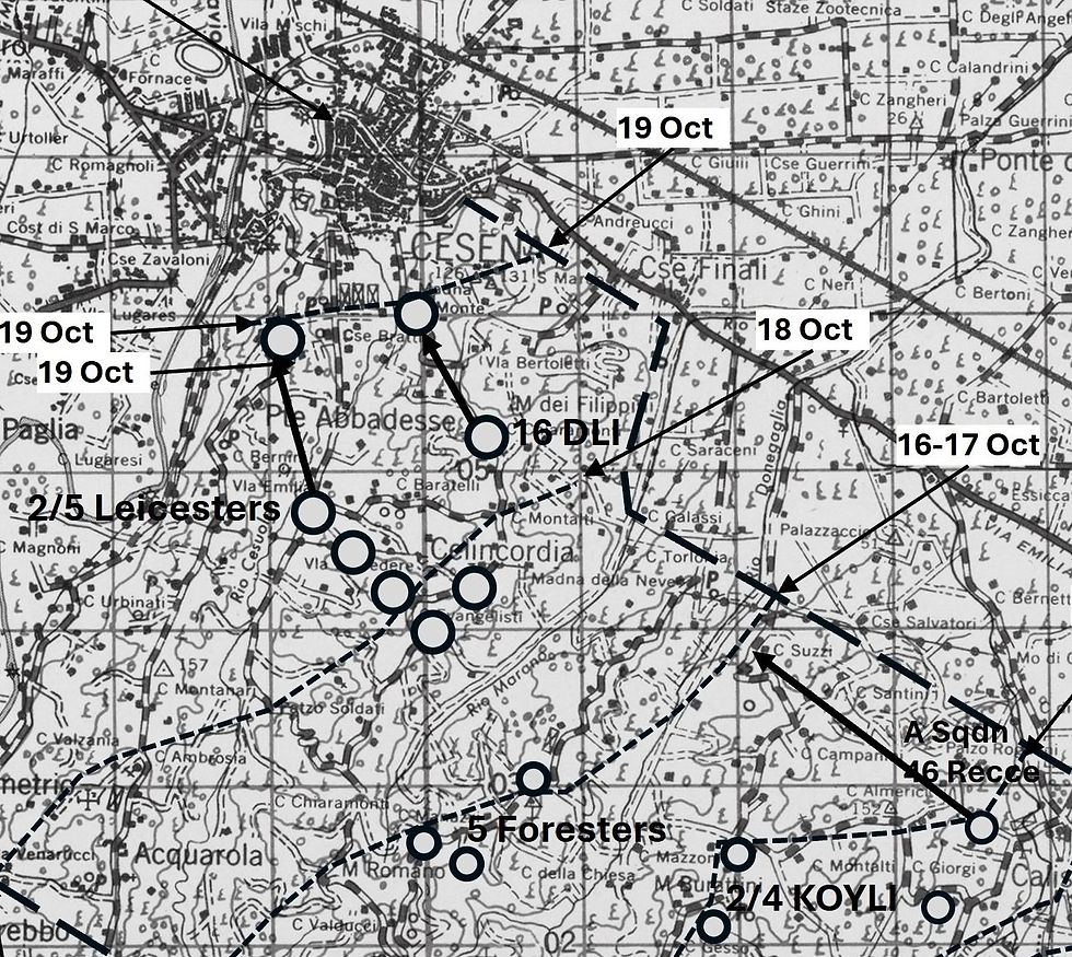 Supported by the entire divisional artillery, as well as tanks of the Queens Bays and Vickers guns from the 9th Manchesters, the divisional machine-gun battalion, the Foresters and Leicesters managed to resume their advance and cleared the two ridges the following day. On 19 October the third battalion in the brigade, the 16th DLI, passed through the Leicesters into the outskirts of Cesena, fighting their way through the streets against determined but uncoordinated resistance. The Foresters meanwhile had made contact with the West Nova Scotia Regiment of the 1st Canadian Division that morning on the Via Emilia.
